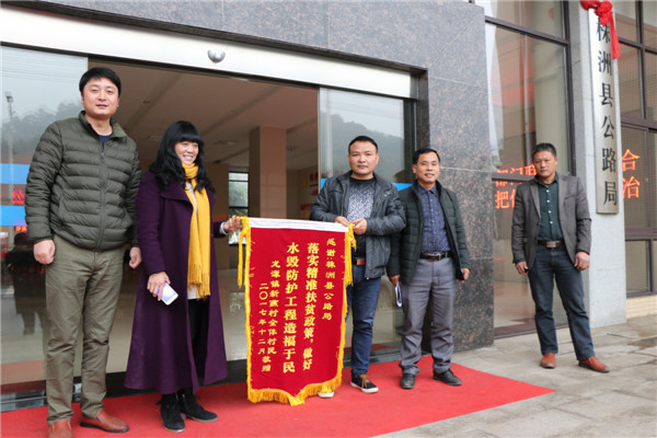 元旦前夕,株洲县龙潭镇新燕村村民代表,将一面写着“落实精准扶贫政策,做好水毁防护工程造福于民”的锦旗,送到了株洲县公路局。